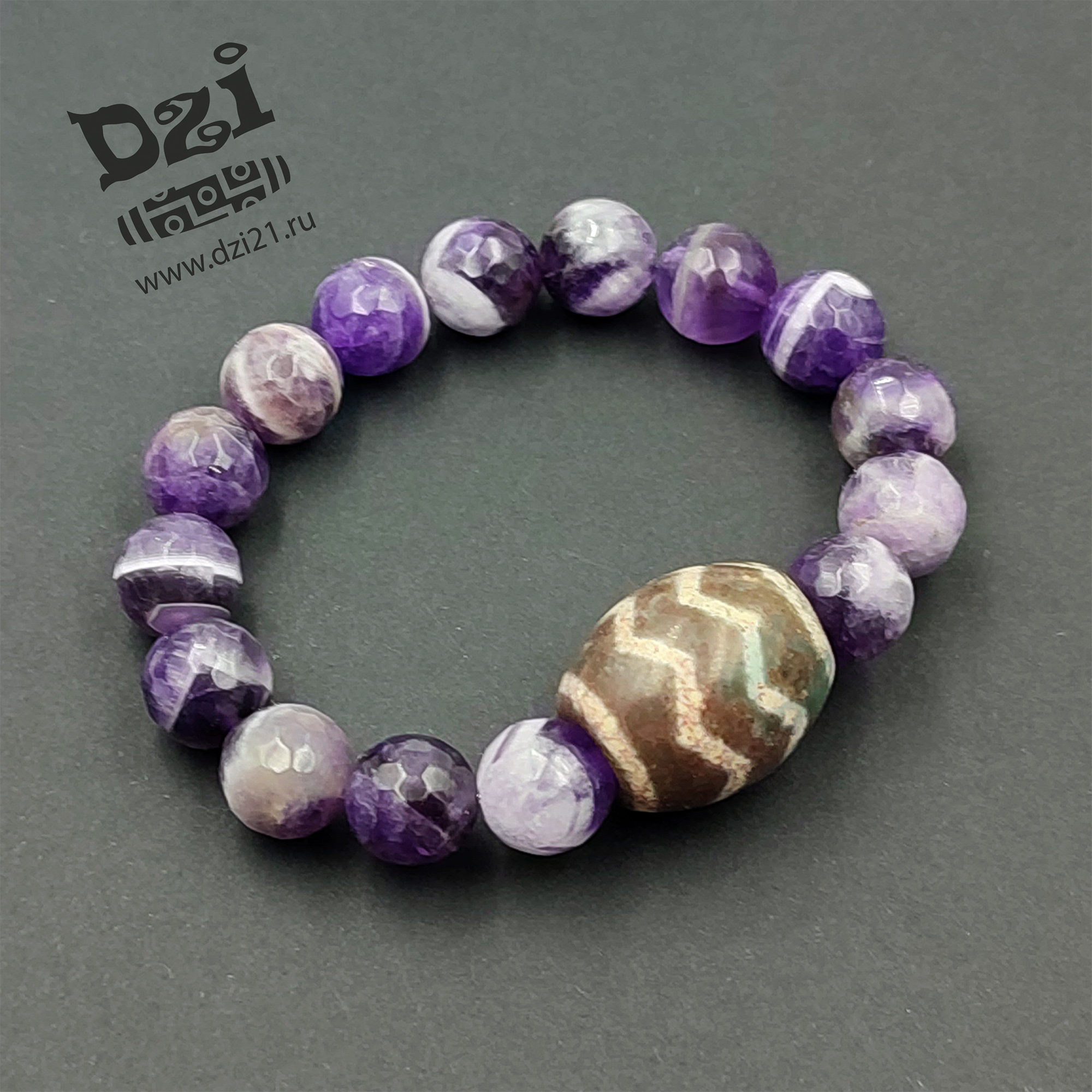 Бусина Дзи: агат. Основной браслет: Аметист граненый 10 mm