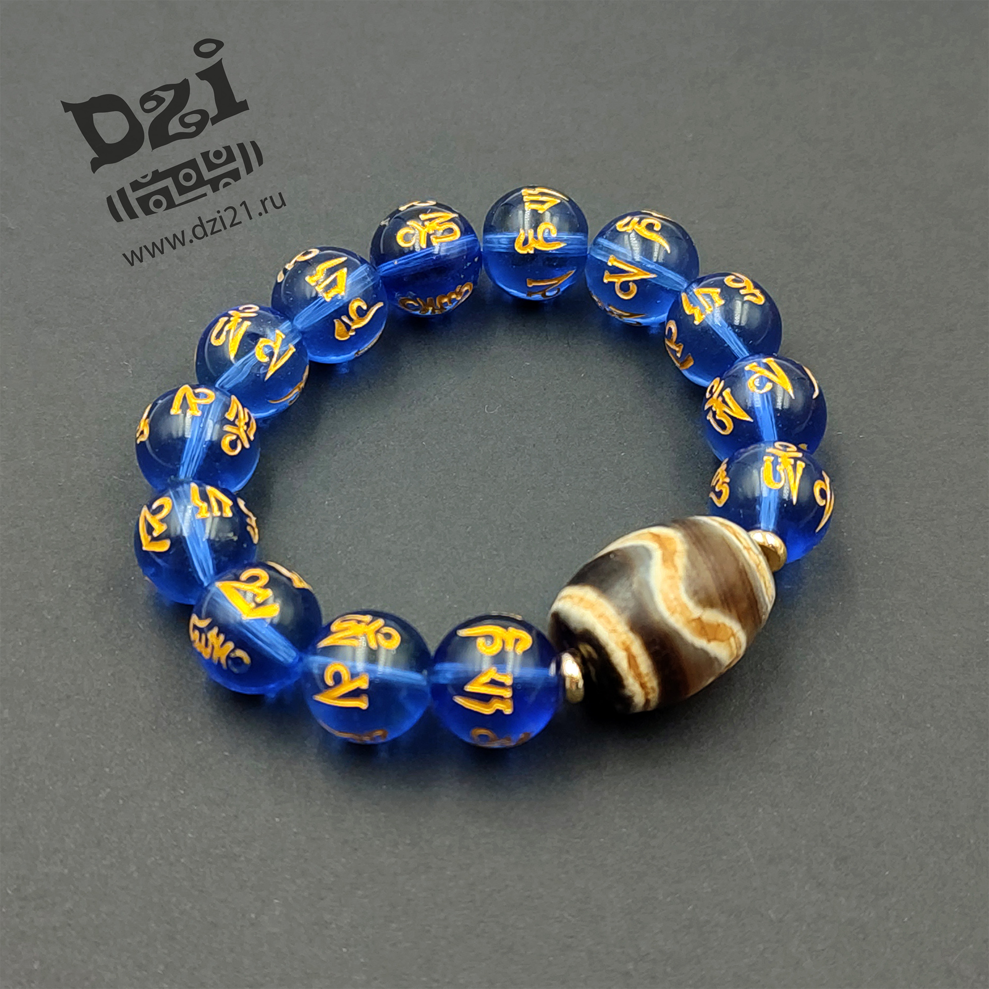 Бусина Дзи: агат. Основной браслет: Кварц синий с мантрой 12 mm
