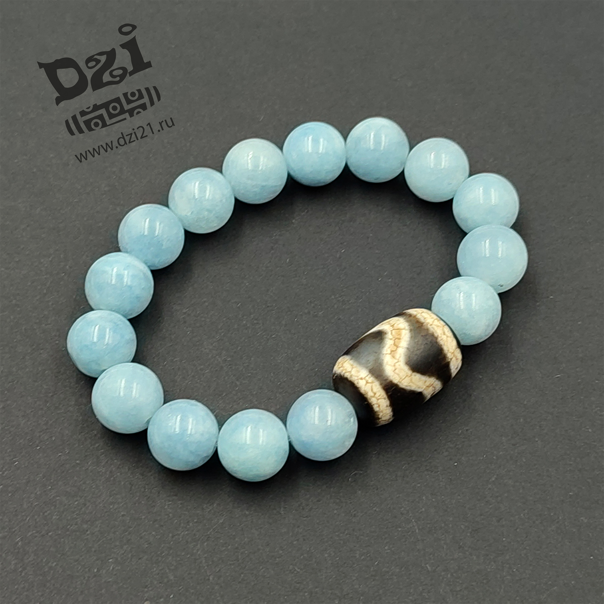 Бусина Дзи: агат. Основной браслет: аквамарин 10 mm.