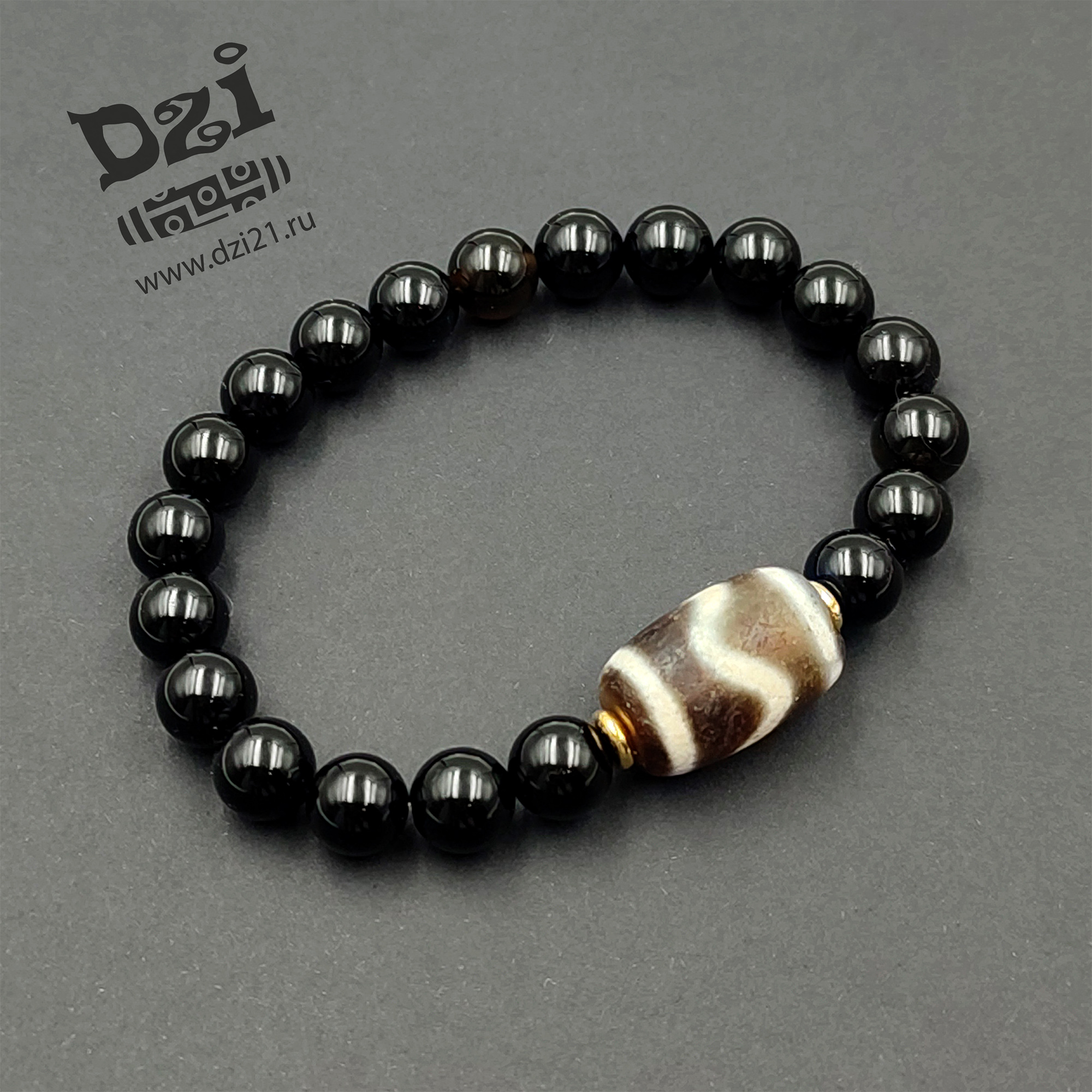 Бусина Дзи: агат. Основной браслет: Агат чернай глянцевый 8 mm