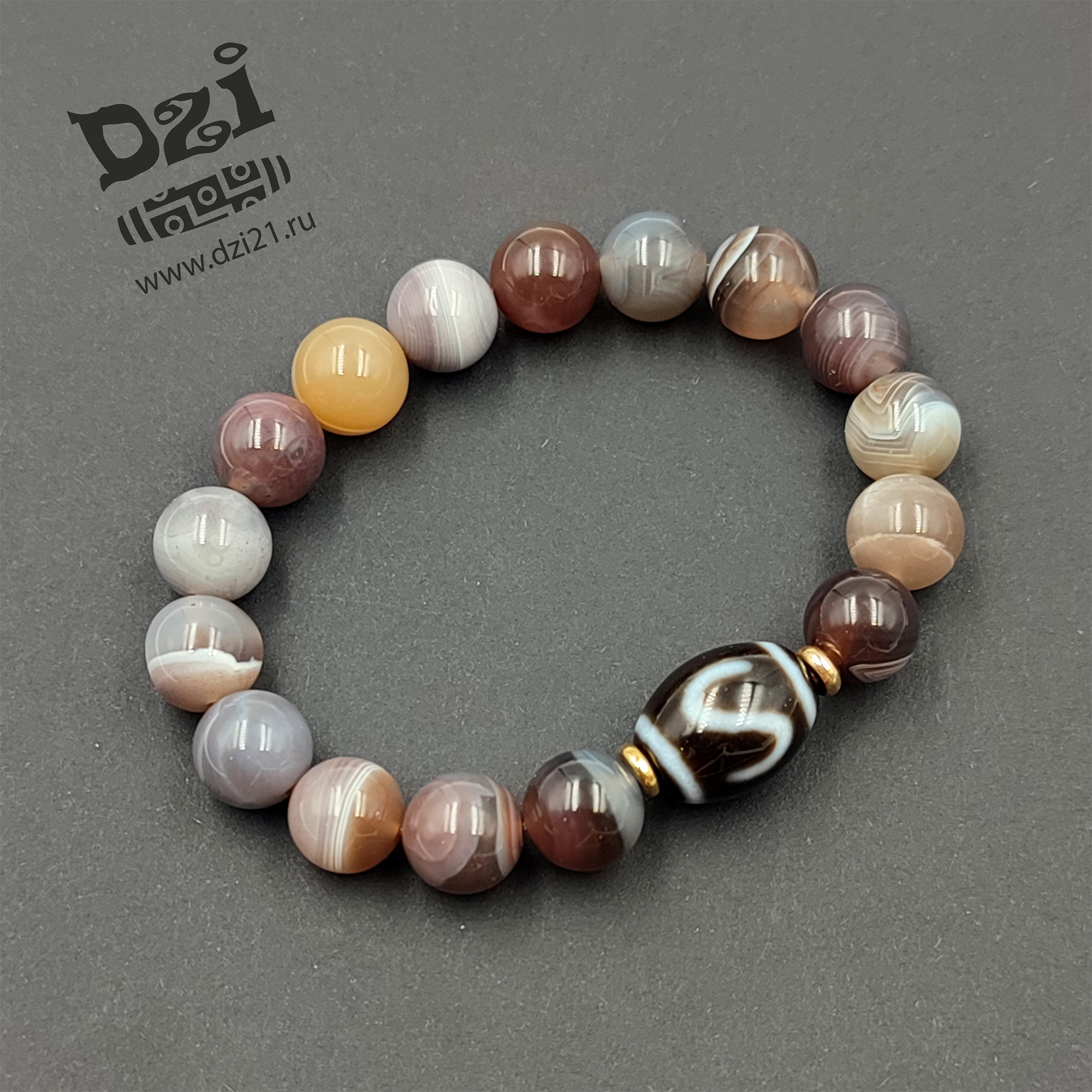 Бусина Дзи: Агат. Основной браслет: Агат полосатый глянцевый 10 mm