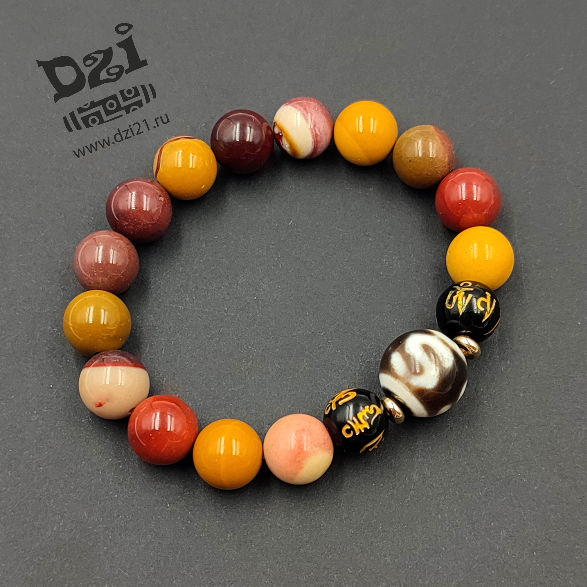 Бусина Дзи: Агат. Основной браслет: Кварц черный с мантрой 10 mm Яшма 10 mm