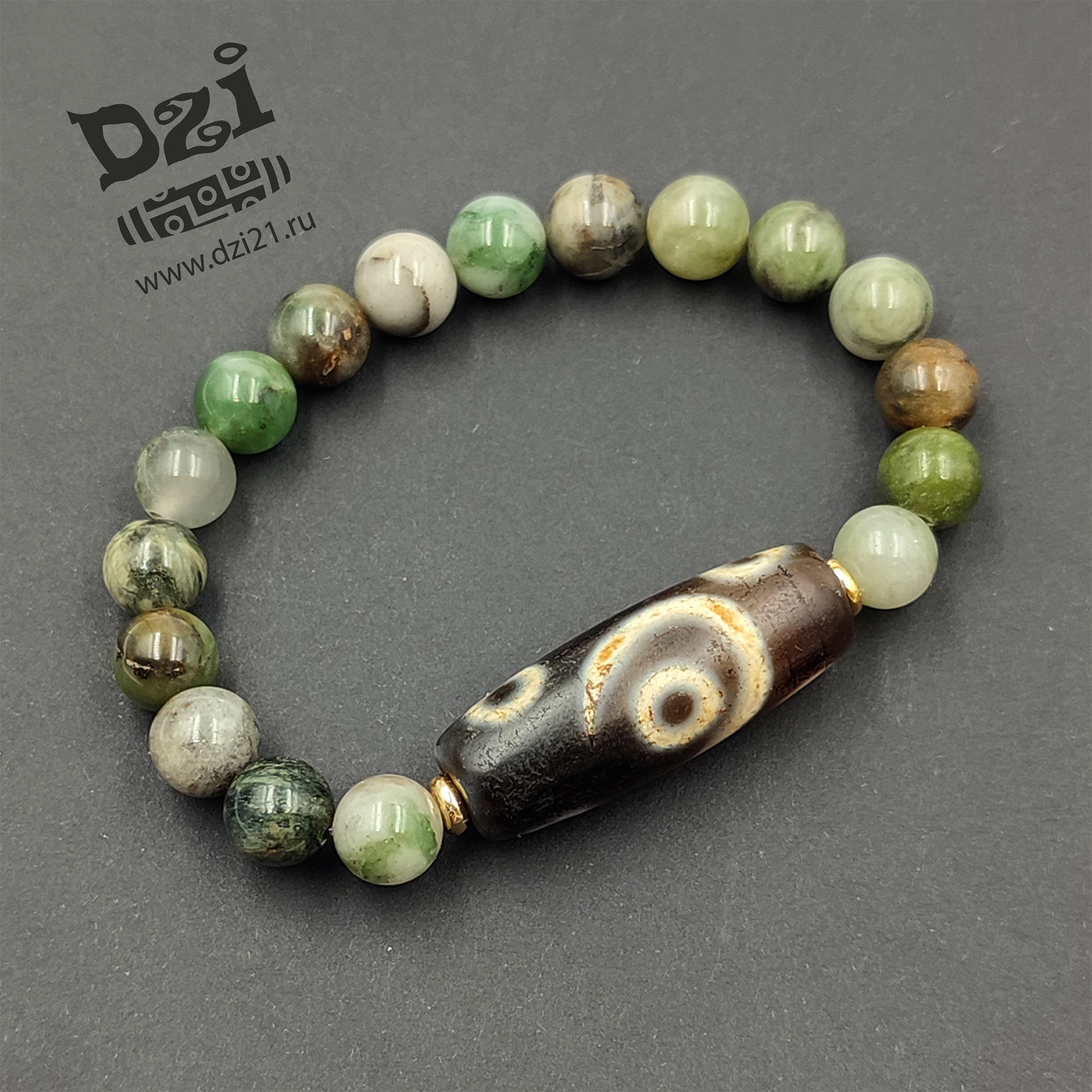 Бусина Дзи: Агат. Основной браслет: Нефрит малазийский 8 mm